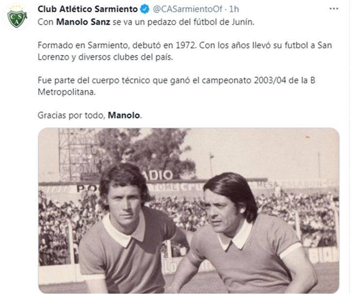 "Formado en Sarmiento, Sanz debutó en 1972. Con los años llevó su futbol a San Lorenzo y diversos clubes del país. Fue parte del cuerpo técnico que ganó el campeonato 2003/04 de la B Metropolitana. Gracias por todo, Manolo" lo despidió el club Sarmiento en sus redes sociales en una foto junto al legendario Horacio 'Taqueta' Barrionuevo, con quien compartió equipo en el Verde de nuestra ciudad.