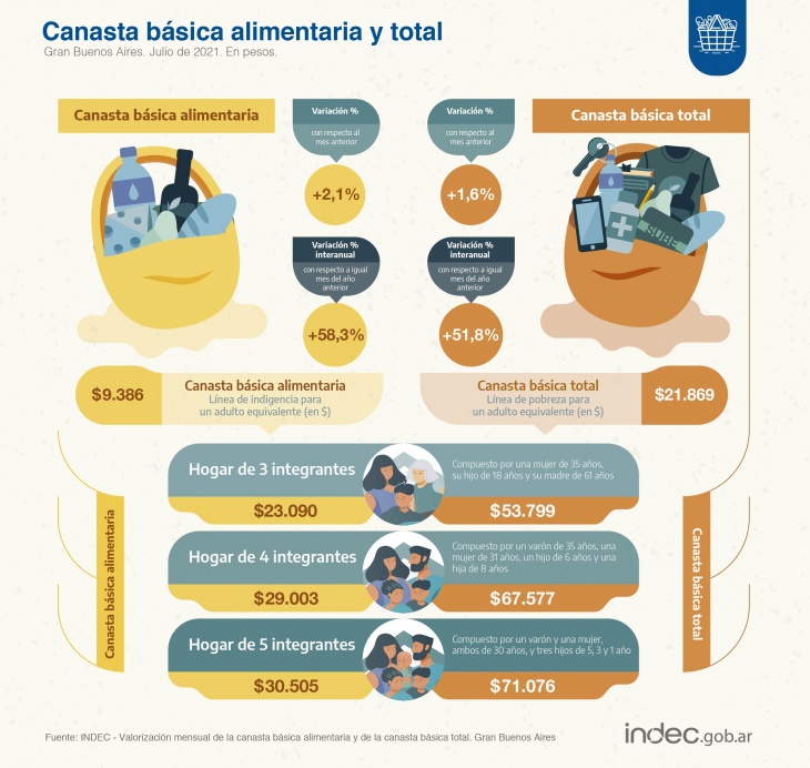 El Instituto Nacional de Estadística y Censos (INDEC) informó esta tarde la variación mensual del costo de la canasta básica alimentaria (CBA), la cual registró en julio un aumento del 2,1%, por lo que una familia tipo con dos hijos menores necesitaron percibir ingresos por $ 29.002,86 para no caer en situación de indigencia.