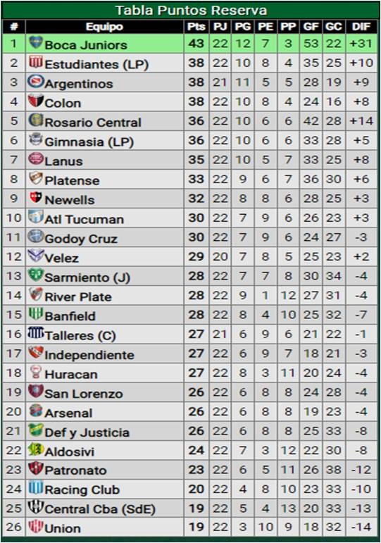 Por la continuidad de la fecha 22 del torneo de Reserva de la AFA el líder Boca igualó sin goles en Dómínico ante Independiente. El Xeneize llegó a 43 puntos, 5 más que sus escoltas Estudiantes, y Colón. Mañana completarán Vélez - Argentinos Juniors y el Bicho de La Paternal podría aprovechar para arrimarse si consigue la victoria.