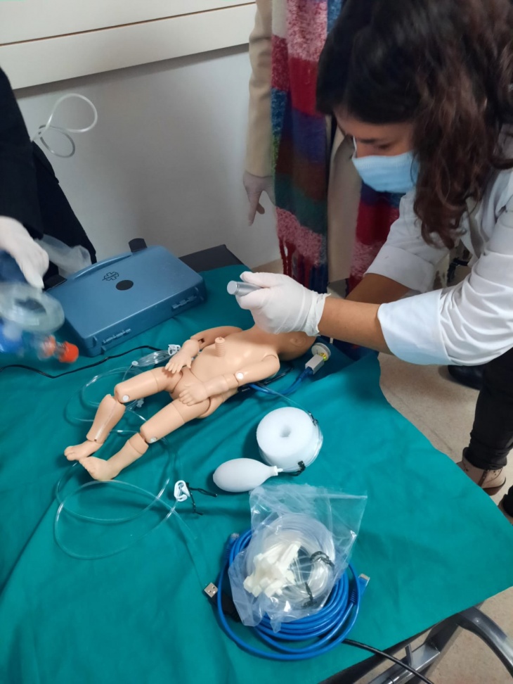 También se ha adquirido un simulador bebé, con apariencia de prematuro de 28 semanas, que tiene la textura y el tamaño real. Está equipado con órganos internos que generan una sensación real y con piel “SmartSkin”, que simula cianosis central y periférica visible, mostrando cambios en la coloración de la piel, mientras se le practica RCP y se le brinda cuidados. Permite, además, a través de un tórax expansible, el manejo de vías respiratorias, intubación nasal y oral, y procedimientos de succión. Cuenta con brazos para prácticas de acceso intravenoso y piernas para prácticas de acceso interóseo. Simula pulso umbilical a través de una bomba manual, favoreciendo el procedimiento de cateterización umbilical y punción en talón.