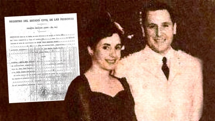 El lunes 22 de octubre se habían casado de civil. Algunos dicen que fue en el registro de Junín, otros que el acto se celebró en casa de la novia, en la calle Arias 171 de esa ciudad; otros que lo habían hecho en la Escribanía Ordiales, situada justo enfrente al domicilio de las Duarte. Y el historiador norteamericano Joseph Page asegura que se casaron en el departamento de la calle Posadas 1567, 4° B, en la ciudad de Buenos Aires.