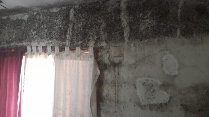 Las paredes al exterior están llenas de hongos negros, en partes el revoque que se ha caído. También hay una invasión de cucarachas que los perros se encargan de mantener a raya.