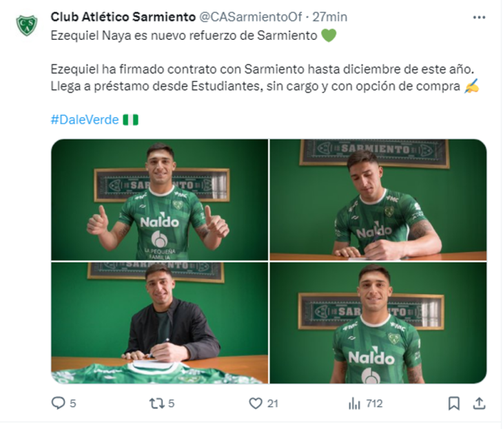 "Ezequiel ha firmado contrato con Sarmiento hasta diciembre de este año. Llega a préstamo desde Estudiantes, sin cargo y con opción de compra" expresó El Verde en sus redes, al anunciar la llegada del delantero a Junín.