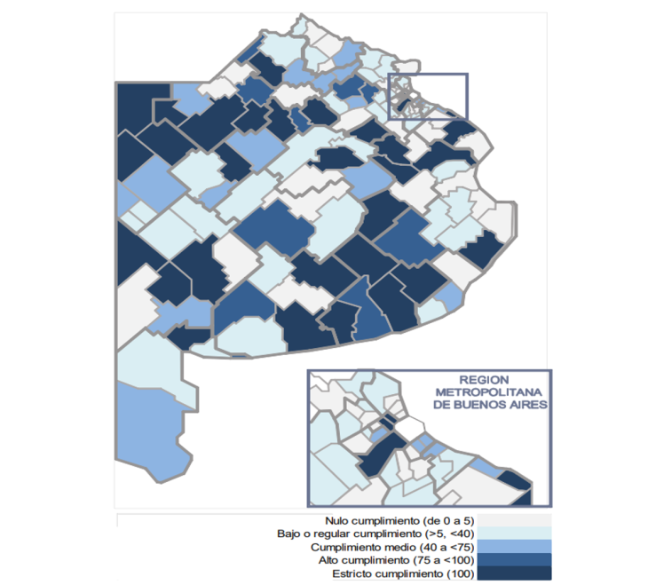 En consecuencia y dado que el 51,1% de los municipios de la Provincia de Buenos Aires muestran índices de transparencia de nivel bajo-regular o nulo, cabe concluir que se requiere un intenso esfuerzo por parte de las jurisdicciones municipales para cumplimentar las disposiciones de la normativa de la Ley de Responsabilidad Fiscal, utilizada como referencia en el presente informe de lo que se considera saludables prácticas de gestión.
