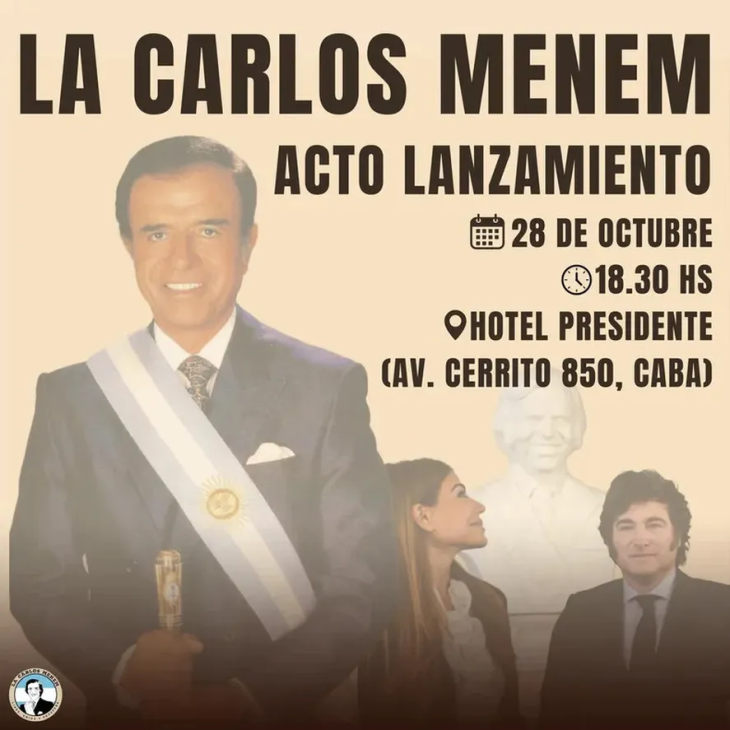Dirigentes y militantes libertarios lanzarán una nueva agrupación denominada "La Carlos Menem”, con el objetivo de "revitalizar el legado" del fallecido ex presidente, esta vez bajo el liderazgo de Javier Milei. La presentación oficial del espacio tendrá lugar el lunes 28 de octubre en el Hotel Presidente, ubicado en el microcentro porteño, donde se espera la participación de figuras allegadas a Menem, así como referentes del movimiento libertario.