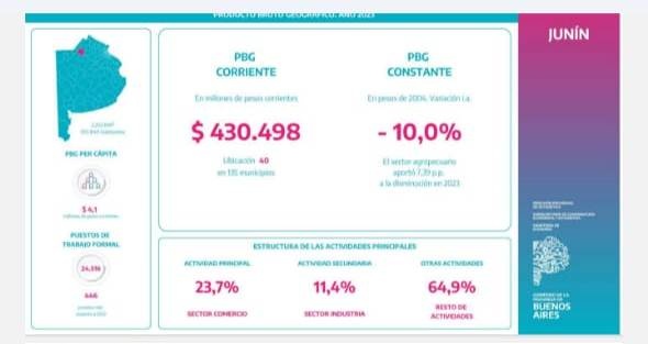 Siguiendo con los números del 2023, el PBG de Junín alcanzó los 430.498 millones de pesos en 2023 y participó 0,63% en el PBG-PBA.