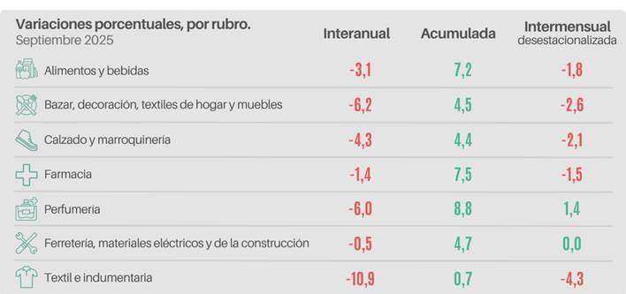 El rubro registró en septiembre una caída interanual del 10,9%. La actividad se vio condicionada por el cambio de temporada, la baja estacional y la limitada disponibilidad de efectivo de los consumidores. Las promociones, liquidaciones y planes de financiación con tarjetas contribuyeron a mantener ventas parciales, especialmente en prendas de media estación y productos asociados a eventos puntuales. La competencia con productos importados y los aumentos de costos operativos y de insumos afectaron los márgenes, mientras que la estacionalidad y la rotación de colecciones determinaron el flujo de ventas en distintos segmentos.