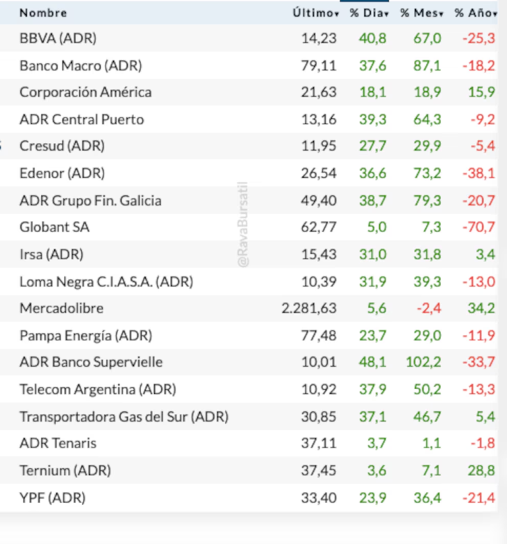 En esa línea, en Wall Street las cotizaciones en dólares de acciones y bonos argentinos también se dispararon. Los títulos Globales -con ley extranjera- avanzaron hasta 24,3%, encabezados por Bonar 2038 (AE38), mientras los ADR treparon hasta 48,1%, con Banco Supervielle al frente. YPF trepó 23,9%, Vista Energy, un 23,7%; Grupo Financiero Galicia, un 38,7%, y Banco Francés, un 40,8 por ciento.