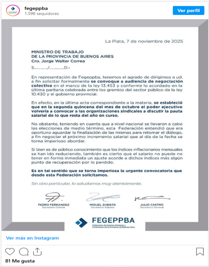 La Federación de Gremios Estatales y Particulares de la Provincia de Buenos Aires (FEGEPPBA), le envió una carta al ministro de Trabajo bonaerense, Walter Correa, advirtiendo que resulta “imperiosa” la necesidad de una convocatoria para negociar una mejora salarial.