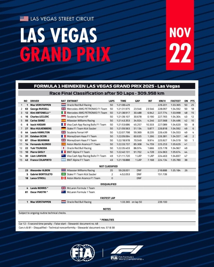 Tanto Lando Norris (2° en pista) como Oscar Piastri (4°) fueron desclasificados producto de una irregularidad técnica que presentaban los MCL39 y que fue verificada por los delegados técnicos junto a tres representantes de la escudería.