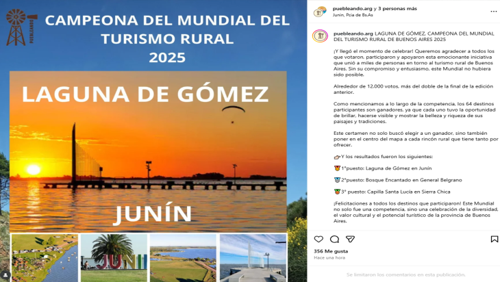La laguna de Gómez resultó la ganadora del concurso organizado por el sitio especializado @puebleando.arg, que convocó a votar por los destinos más representativos de la provincia de Buenos Aires. Junín participó con su principal emblema turístico, la Laguna de Gómez, posicionándose entre los atractivos más valorados por usuarios y visitantes. En todo el concurso participaron 64 atracciones de 62 localidades y 49 Partidos en 23 categorías.