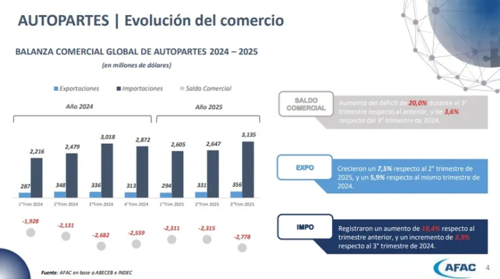 El autopartismo registró un déficit de u$s 7400 millones entre enero y septiembre de 2025, un salto del 9,8% interanual y del 18% respecto del trimestre previo. Las importaciones crecieron 8,7% y las exportaciones apenas avanzaron 1,1%, según datos de la Asociación de Fábricas Argentinas de Componentes (AFAC).