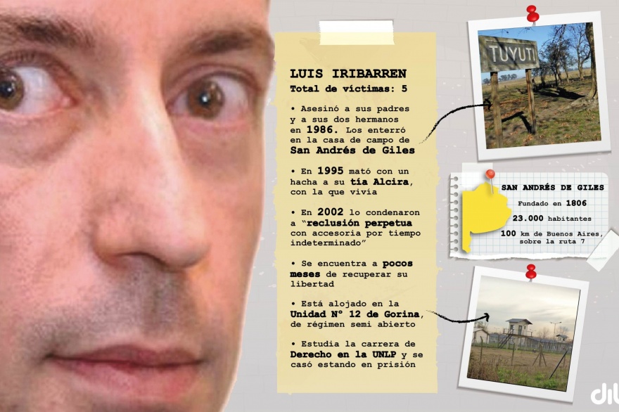 “El Carnicero de San Andrés de Giles”, como lo bautizaron a nivel local, llegó rápidamente a las primeras planas del país y hasta Los Fabulosos Cadillacs le dedicaron un tema. Hoy Iribarren, con 24 años ininterrumpidos en la cárcel, está cerca de recuperar la libertad. Está en el penal platense de Gorina, a punto de recibirse de abogado y casado. Por su condena a reclusión perpetua (25 años), esto último no suma a su favor ante la Justicia. “El Chacal”, como lo apodan, saldrá pronto y probablemente vuelva a Giles, donde figura su domicilio.