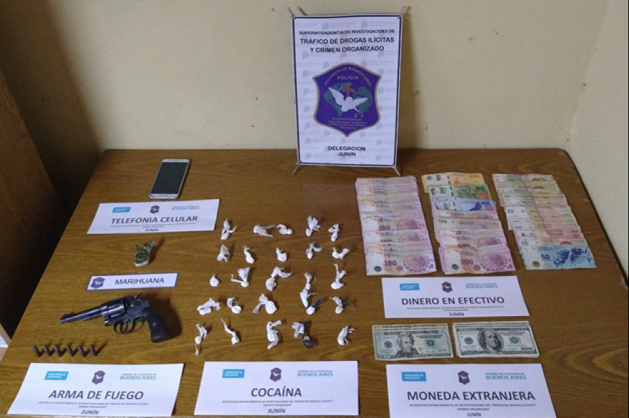 Como resultado, se pudo secuestrar clorhidrato de cocaína fraccionada para su comercialización, un arma de fuego con municiones en su tambor, telefonía celular y una alta suma de dinero en efectivo. Además se efectivizó la aprehensión del masculino mayor de edad, quien quedó a disposición de magistrado de intervención.