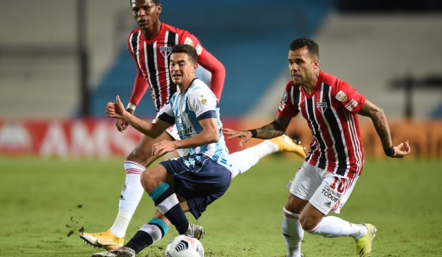 En un intenso primer tiempo, Racing tuvo en la movilidad de Lovera, su carta ofensiva. El ex Rosario Central se mostró incisivo, a pura gambeta. Los dirigidos por Pizzi pudieron irse en ventaja de no haber estrellado dos tiros en el travesaño. San Pablo también estuvo cerca con un tiro libre de Dani Alves, que mostró su jerarquía, junto a Luciano y Reinaldo, en un primer tiempo caldeado en el que ninguno pudo romper el cero.