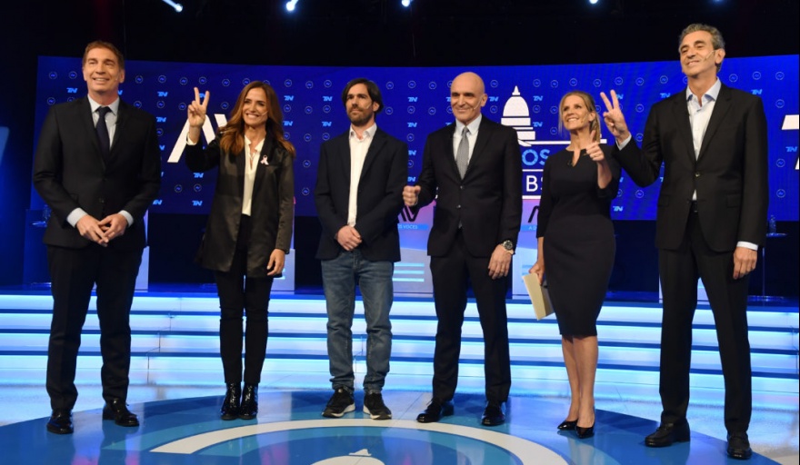 En atriles que fueron previamente sorteados, se pudo ver a los candidatos de Juntos Diego Santilli; del Frente de Todos (FdT), Victoria Tolosa Paz; del Frente de Izquierda Unidad (FIT), Nicolás del Caño; de Avanza Libertad, José Luis Espert; del Frente Más Valores, Cynthia Hotton, y de Vamos con Vos, Florencio Randazzo.