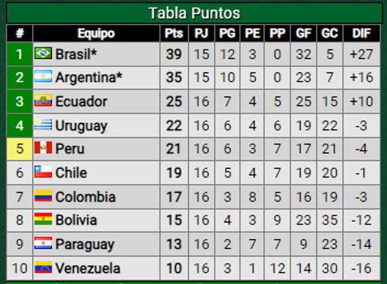 Las posiciones las lidera Brasil con 39, Argentina 35, Ecuador 25 y Uruguay 22. Perú con 21, Chile -19-, Colombia 17 y Bolivia con 15 siguen con chances.