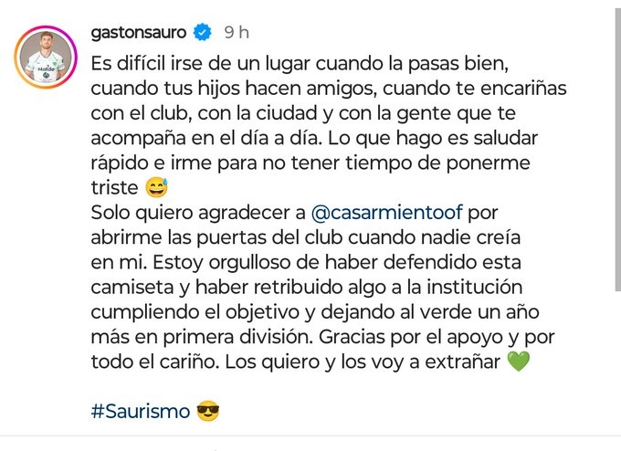 Gastón Sauro se despidió en Instagram. Continuará su carrera en Huracán. El defensor, por quien había expectativas por su continuidad, finalmente no acordó con Sarmiento y seguirá su carrera en el Globo de Parque Patricios, donde compartirá vestuario con el Pata Castro, otro de los que emigró del Verde de Junín.
