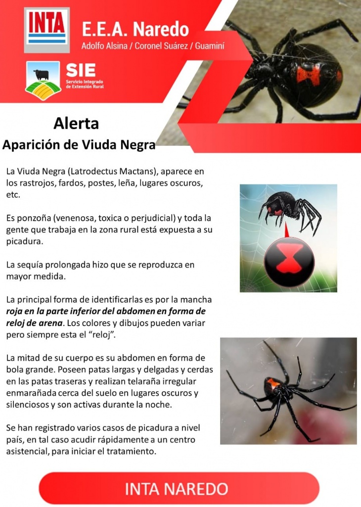 La estación experimental del INTA Naredo (Adolfo Alsina, Coronel Suárez, Guaminí) emitió una alerta por la aparición frecuente de arañas viuda negra en distintos puntos del país. La sequía habría favorecido la reproducción de esta peligrosa especie. La Viuda Negra (Latrodectus Mactans) aparece en los rastrojos, fardos, postes, leña, lugares oscuros, entre otros lugares.