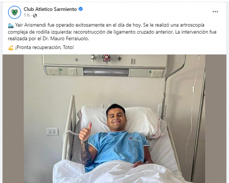 "Yair Arismendi fue operado exitosamente en el día de hoy. Se le realizó una artroscopía compleja de rodilla izquierda: reconstrucción de ligamento cruzado anterior. La intervención fue realizada por el Dr. Mauro Ferraiuolo. ? ¡Pronta recuperación, Toto!" escribió el club en sus redes sociales con la imagen del jugador.