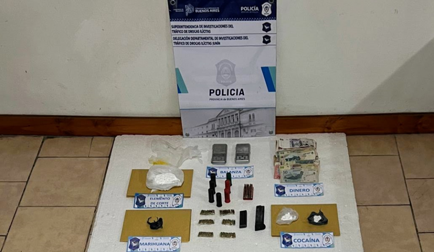La Delegación Departamental de Investigaciones del Tráfico de Drogas Ilícitas Junin realizó un allanamiento en una vivienda del barrio Los Almendros de Junín donde logró incautar una cantidad importante de bolsas de clorhidrato de cocaína fraccionada y lista para comercializar, balanzas de precisión, elementos de corte, municiones de armas de fuego y dinero en efectivo.