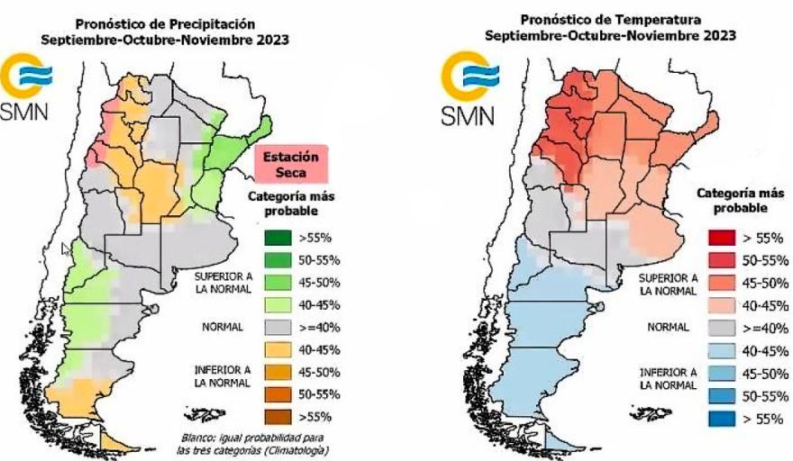 “Para el trimestre septiembre, octubre y noviembre, se prevén precipitaciones normales o superiores a los valores normales en la Mesopotamia y en el oeste de la Patagonia. Sin embargo, en Córdoba, en el extremo sur de Santa Fe, en el oeste de San Luis y en el NOA se pronostican precipitaciones normales o inferiores a esos valores”.