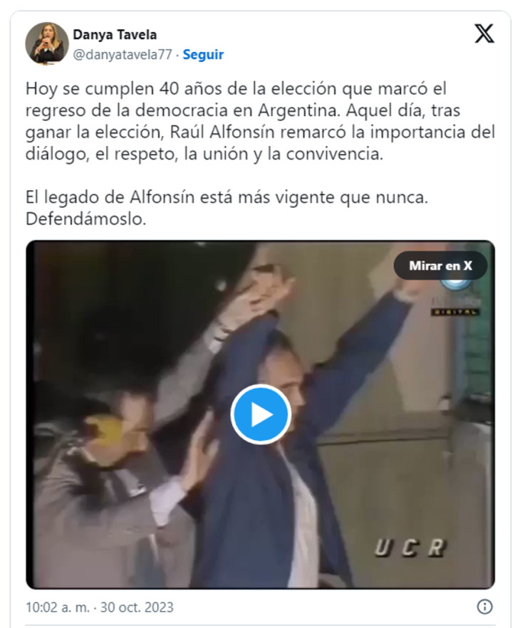 El primero difundió una placa conmemorativa, acompañada por el siguiente texto: "Se celebran 40 años de la elección que marcó la recuperación de la democracia. El 30 de octubre de 1983, Raúl Alfonsín fue elegido presidente tras siete años y meses de dictadura militar y asumió la presidencia el 10 de diciembre de ese año".