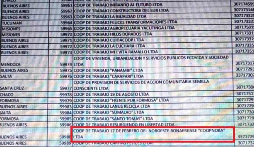 En el listado que brindó el gobierno nacional, que consta de 149 páginas, la “COOP DE TRABAJO 17 DE FEBRERO DEL NOROESTE BONAERENSE "COOPNOBA" LTDA. , bajo el CUIT 33717295019”, figura en la página 66, como “Cooperativas Vigentes Con RLM y Sin Presentación de Documentación”, motivo por el cual deberá poner a disposición del INAES los requerimientos solicitados para no ser suspendida.