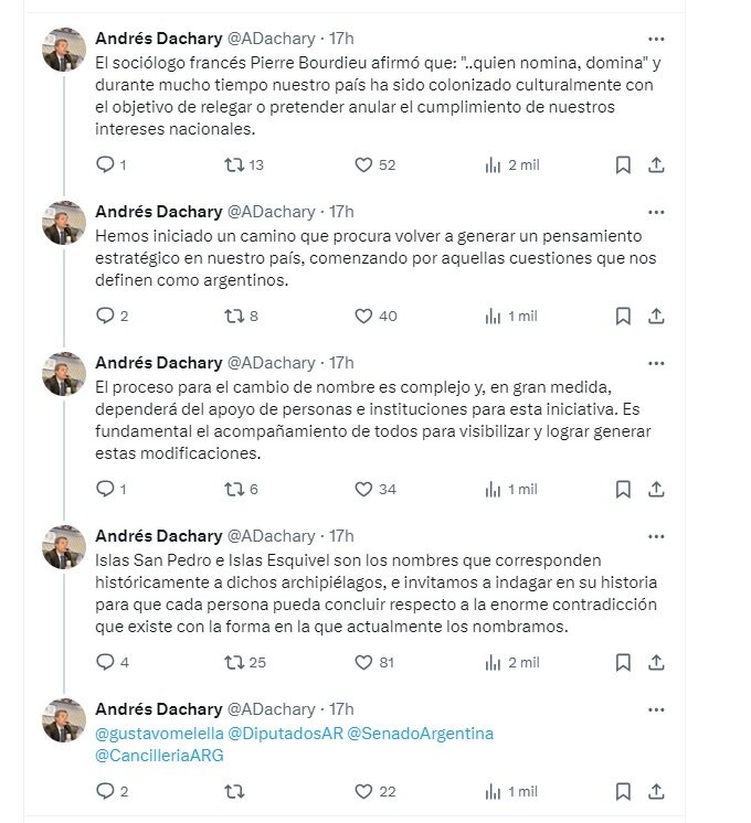 “Hemos iniciado un camino que procura volver a generar un pensamiento estratégico en nuestro país, comenzando por aquellas cuestiones que nos definen como argentinos”, expuso Dachary en su cuenta personal de la red X.