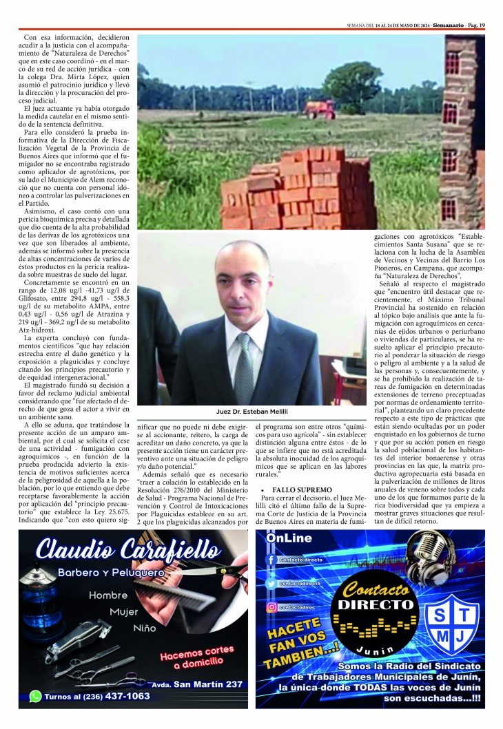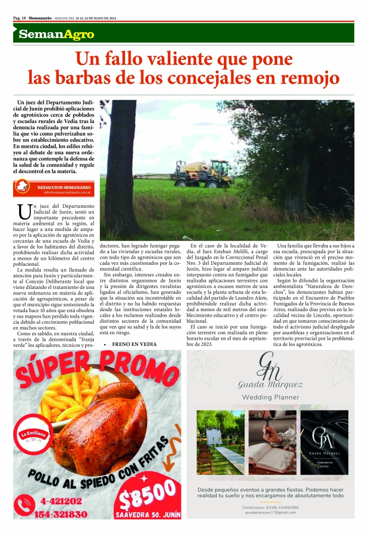 Un juez del Departamento Judicial de Junín, sentó un importante precedente en materia ambiental en la región, al hacer lugar a una medida de amparo por la aplicación de agrotóxicos en cercanías de una escuela de Vedia y a favor de los habitantes del distrito, prohibiendo realizar dicha actividad a menos de un kilómetro del centro poblacional.