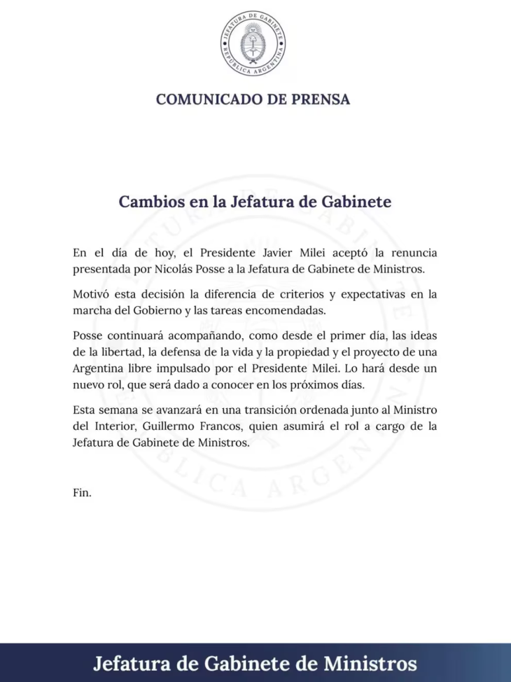 “En el día de hoy, el presidente Javier Milei presentó la renuncia presentada por Nicolás Posse a la Jefatura de Gabinete de Ministros. Motivó esta decisión la diferencia de criterios y expectativas en la marcha del Gobierno y las tareas encomendadas. Posse continuará acompañando, como desde el primer día, las ideas de la libertad, la defensa de la vida y la propiedad y el proyecto de una Argentina libre, impulsado por el Presidente Milei. Lo hará desde un nuevo rol, que será dado a conocer en los próximos días. Esta semana se avanzará en una transición ordenada junto al Ministro del Interior, Guillermo Francos, quien asumirá el rol a cargo de la Jefatura de Gabinete de Ministros. Fin”.