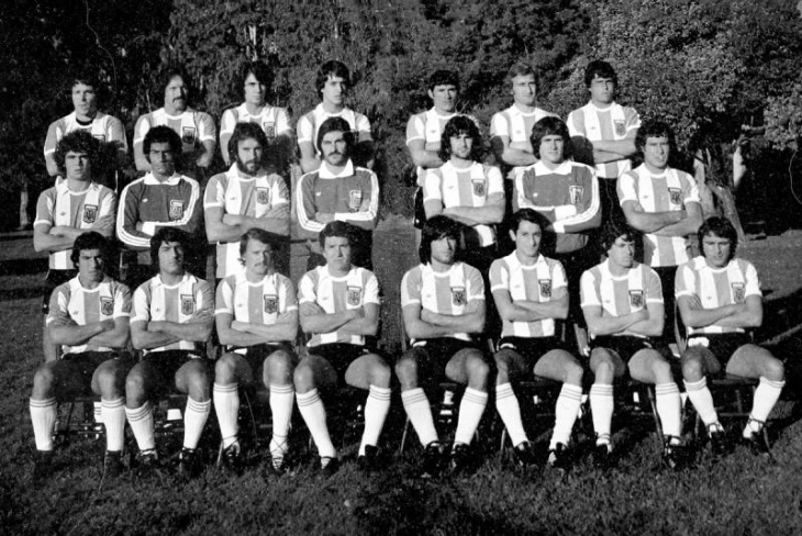 Al medio de izquierda a derecha: Alberto Tarantini, Héctor Baley, Ricardo Villa, Ricardo La Volpe, Mario Kempes, Ubaldo Fillol. Daniel Killer.