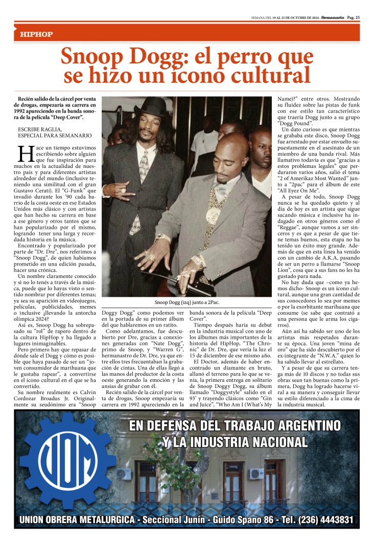 SECCIÓN HIPHOP PUBLICADA EN LA EDICIÓN IMPRESA Y EDICIÓN DIGITAL Nº 432 DE SEMANARIO DE JUNÍN. CORRESPONDE A LA SEMANA DEL 19 AL 25 DE OCTUBRE DE 2024