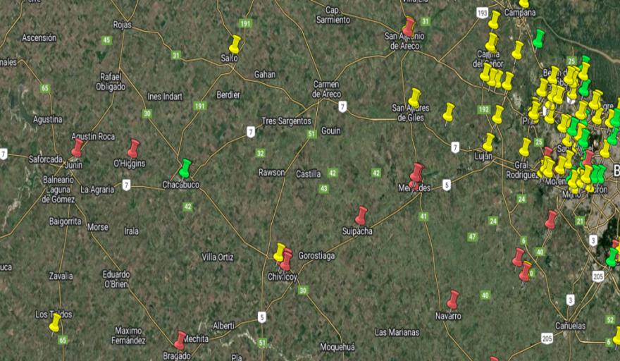 En la Provincia, los puntos rojos, con más de 50 partes por billón (ppb) de arsénico por litro, es decir 0,05 miligramos por litro (mg/l), están en Tres Arroyos, Balcarce, Junín, Mar de Ajó, Santos Unzué (9 de Julio), Tres Algarrobos, Merced (Pergamino), Monte, Lobos, Navarro, Suipacha, Las Heras, San Vicente y Cañuelas.
