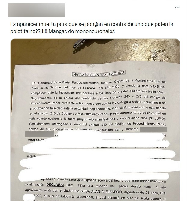 Más tarde, además, entre varias publicaciones que realizó, publicó un extracto de la denuncia que efectuó con un mensaje crítico para quienes pusieron su testimonio en duda: “¿Es aparecer muerta para que se pongan en contra de uno que patea la pelotita, no? Manga de mononeuronales”.