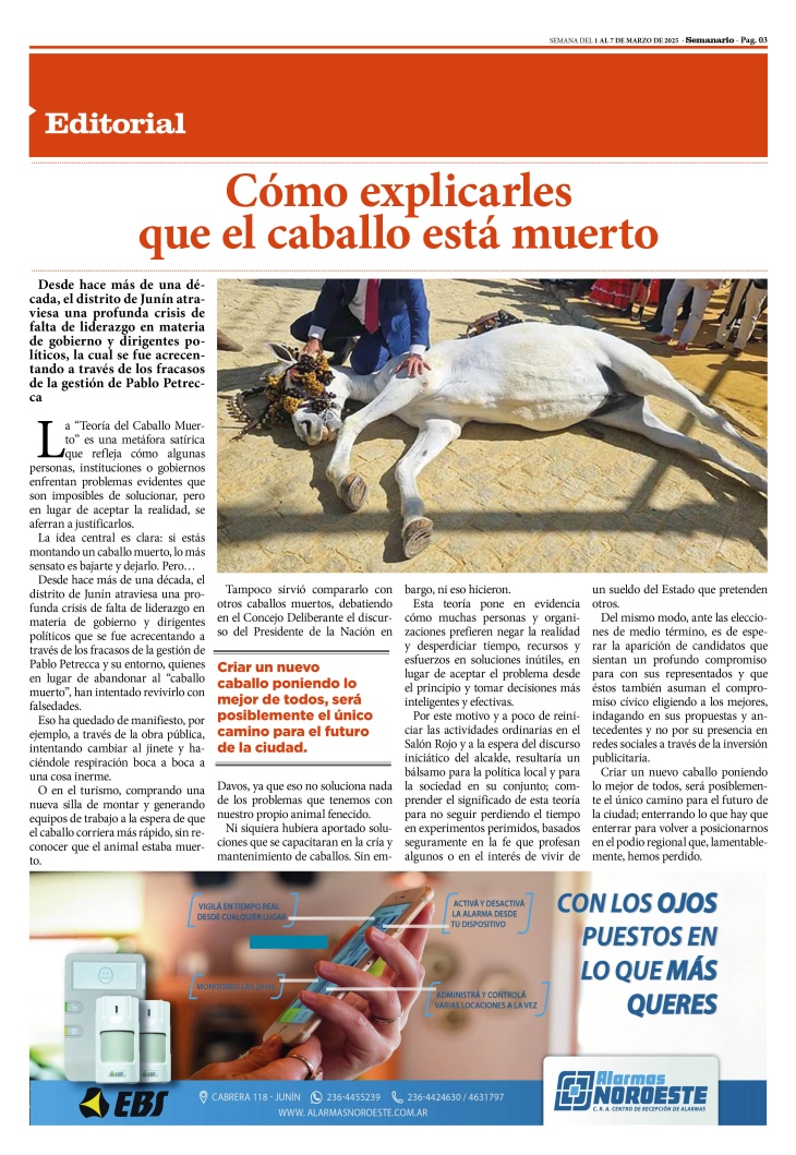 Desde hace más de una década, el distrito de Junín atraviesa una profunda crisis de falta de liderazgo en materia de gobierno y dirigentes políticos que se fue acrecentando a través de los fracasos de la gestión de Pablo Petrecca y su entorno, quienes en lugar de abandonar al “caballo muerto”, han intentado revivirlo con falsedades.