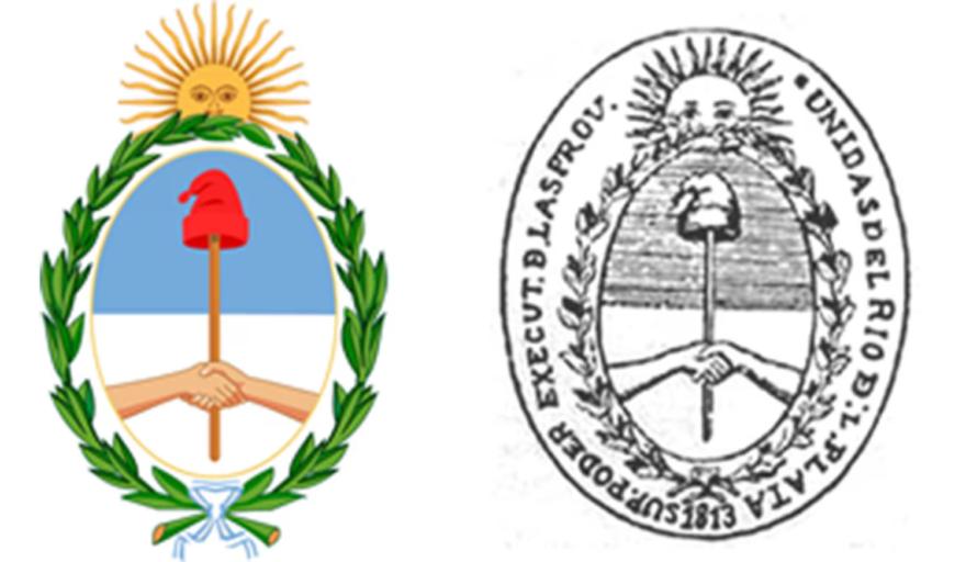 El Escudo Nacional está dividido en dos campos: el superior de color azul y el inferior blanco, evocando los tonos de la bandera argentina. En su centro, dos antebrazos humanos estrechan sus manos, simbolizando la unión de los pueblos de las Provincias Unidas del Río de la Plata.