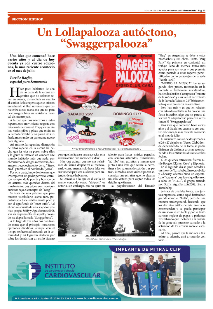 SECCIÓN HIPHOP PUBLICADA EN LA EDICIÓN IMPRESA Y EDICIÓN DIGITAL Nº 476 DE SEMANARIO DE JUNIN. SEMANA DEL 22 AL 29 DE AGOSTO DE 2025
