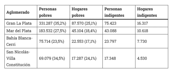 En la Región Pampeana, donde se incluyen varios aglomerados bonaerenses del interior, la pobreza afectó al 30,5% de las personas y al 22,0% de los hogares, con una indigencia de 6,4% y 4,9%.