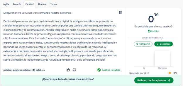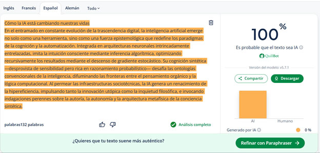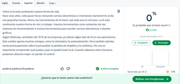 Ahora que ya conoces el proceso de humanización de contenido, veamos este párrafo, que humanicé utilizando los métodos mencionados. Lo generé desde ChatGPT y lo pasé por un detector de IA. Se marcó como 100 % generado por IA.