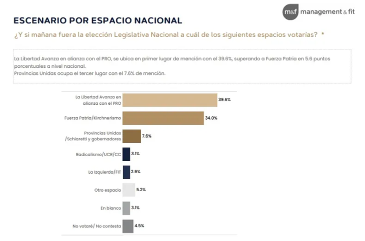Según el estudio, realizado entre el 15 y el 25 de septiembre en todo el país, la fuerza libertaria se impone en los comicios de medio término dejando en segundo lugar a su al PJ, su principal rival. En tercer lugar aparece Provincias Unidas, el espacio que reúne al cordobés Juan Schiaretti y otros gobernadores, con un 7,6% de apoyo. Los números de este relevamiento anticipan un escenario polarizado entre La Libertad Avanza y Fuerza Patria, que discuten dos modelos económicos totalmente distintos.