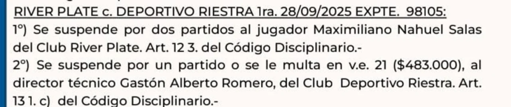 El ente ratificó la sanción para Maximiliano Salas, quién vio la roja el pasado fin de semana en el Estadio Monumental en la derrota del “Millonario” por 2 a 1 frente a Deportivo Riestra. El delantero tendrá dos partidos de ausencia como pena luego de recibir la tarjeta roja por parte de Pablo Echavarría.