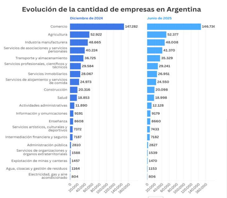 A pesar del contexto general de retracción, algunos sectores mostraron un leve crecimiento en el número de empresas formales. El mayor aumento se observó en servicios de asociaciones y servicios personales, que sumaron 1.146 firmas, un alza del 2,8%.