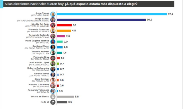 De acuerdo al informe, la diferencia de más de siete puntos posiciona al ex canciller como el principal competidor en un escenario polarizado entre el oficialismo nacional y el peronismo bonaerense. Detrás se ubican Florencio Randazzo (Provincias Unidas) con 4,8%, y el resto de los espacios apenas supera el 1% de adhesión. También el Frente de Izquierda estaría realizando una buena elección, quedando como tercera fuerza con el 5.1% que consiguió Nicolás del Caño en la encuesta