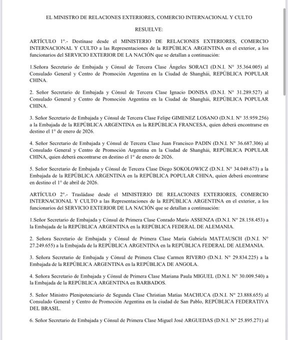 La resolución firmada por Werthein el 22 de octubre, apenas horas antes de oficializar su salida, dispone una amplia reestructuración del servicio exterior, con destinos en más de 40 países y fechas de arribo escalonadas entre diciembre de 2025 y abril de 2026. Entre los nombramientos figuran traslados a consulados como Nueva York, Miami, Shanghái, Beijing, Londres y Moscú, además de nuevas asignaciones en África, Medio Oriente y el Caribe.