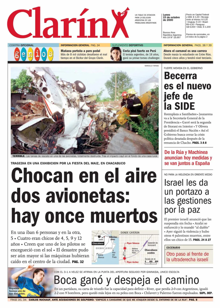 Pero una terrible tragedia enlutó la celebración: las dos aeronaves que realizaban los vuelos de bautismo chocaron en el aire y murieron 11 personas, entre ellos cuatro niños. Hoy la jornada, de la que se cumplieron 25 años, se recuerda como el día más triste de Chacabuco.