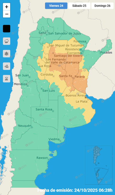 El domingo -día de elecciones nacionales- el tiempo se presentará con cielo parcialmente nublado, mínima de 10 grados y máxima de 24 grados mientras que el lunes 27 por la mañana estará parcialmente nublado, mínima de 9 grados y a la tarde chaparrones con máxima de 16 grados.