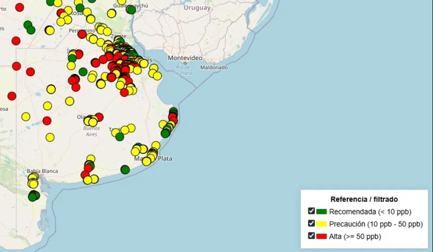 En tanto, hay otros pozos que el semáforo marca en amarillo, donde la presencia de arsénico en el agua es entre 10 y 50 partes por billón (ppb), de 0,01 mg/l a 0,05 mg/l. En este caso, aparecen en alerta zonas de Villa Gesell; Mar del Plata; Tres Arroyos; Olavarría, Azul; Villarino, Salliqueló; Bolívar; Junín; San Pedro; Baradero; La Plata y varias comunas del Gran Buenos Aires.