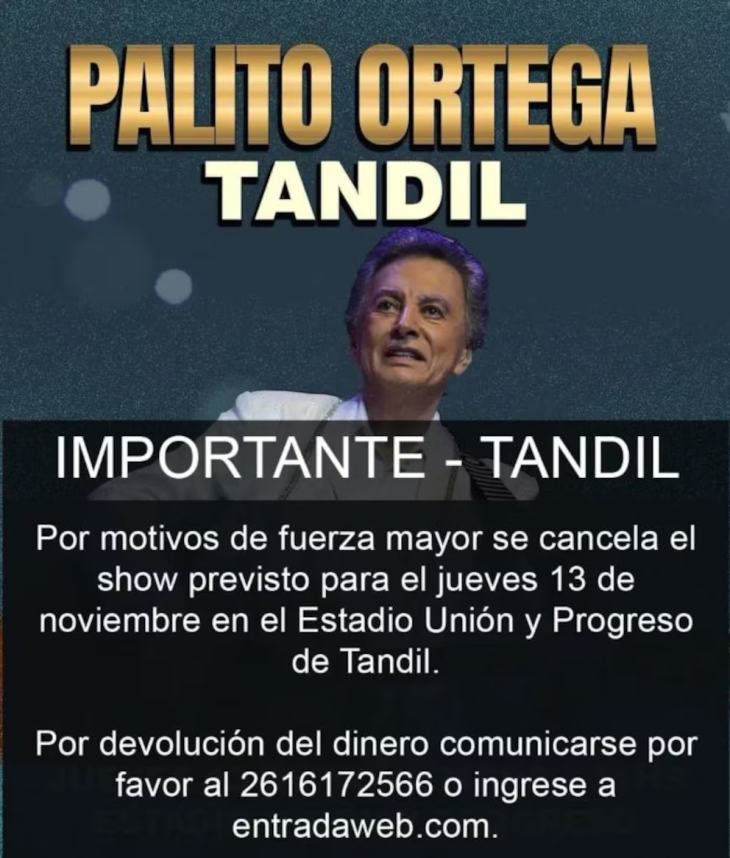 La cancelación del show de Palito Ortega en Paraná por causas de fuerza mayor del artista, activó un operativo especial para la devolución de entradas. El espectáculo, programado para el 9 de noviembre, no se realizará porque el reconocido músico, dijeron desde Paracima Producciones, “no se encuentra en condiciones de brindar el show”.