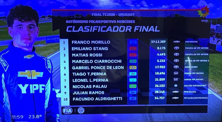 En una definición apasionante en la última vuelta y con Emiliano Stang soldado a su paragolpes trasero, el juninense Franco Morillo coronó su actuación en Uruguay con una gran victoria en la final de Tc 2000 que se corrió este domingo en el trazado de Mercedes.